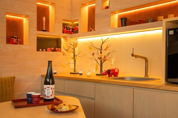 お客様は乗車前後いずれかで、磐梯山温泉ホテルに宿泊します。館内では、赤べこや起き上がり小法師など、会津に古くから伝わる縁起物作りを体験できます。また、オプションで、福島のフルーツとお酒を楽しめる1日1組限定の特別ルームでの滞在を楽しめます。広さ104平米のスイートルームの中に、さまざまな果物が木に生っているかのように盛り付けられたドライフルーツセットと、利き酒師がセレクトした地酒を用意。果物狩りをしているような気分でお好きなドライフルーツを食べながら、日本酒とのマリアージュを堪能できます。