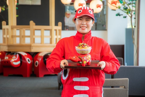 磐梯山(ばんだいさん)の麓に位置するリゾートホテル「星野リゾート 磐梯山温泉ホテル」(所在地:福島県磐梯町、以下、磐梯山温泉ホテル)と、「東日本旅客鉄道株式会社仙台支社(所在地:宮城県仙台市、以下JR東日本)会津若松エリアプロジェクト」は、2022年11月4日、7日、14日、21日の4日間、幸せを感じる食材や赤べこなど「福島の福」をテーマにした特別列車「福がくるくるフルーティア」を運行します。本列車は、走るカフェがテーマの列車「フルーティアふくしま」と磐梯山温泉ホテルがコラボレーションした特別列車です。車内では、当ホテルオリジナルのスイーツセットを提供し、幸せを運ぶ牛として親しまれている郷土玩具「赤べこ」に扮したスタッフがサービスを行います。乗車前後には、磐梯山温泉ホテルに宿泊し、館内で会津の文化体験を思う存分楽しめます。さらに、オプションとして本列車に乗車した方限定で、当ホテルの特別ルームへ宿泊できるオプションも用意しています。