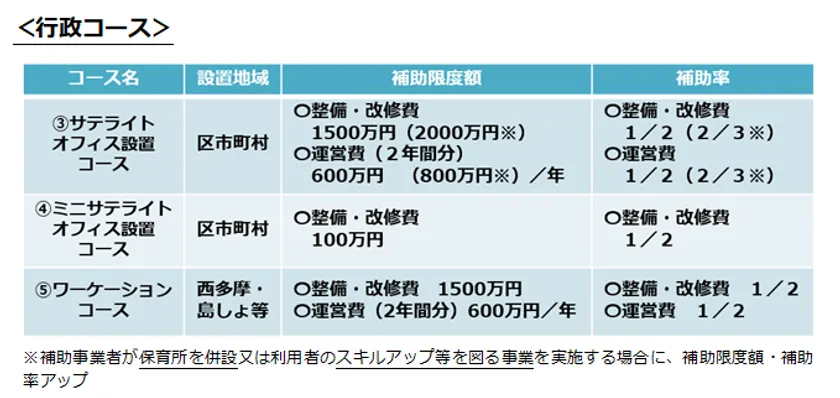 ※補助事業者が保育所を併設又は利用者のスキルアップ等を図る事業を実施する場合や、サテライトオフィス整備推進地域に設置する場合(整備・改修費のみ)に、補助限度額・補助率アップ