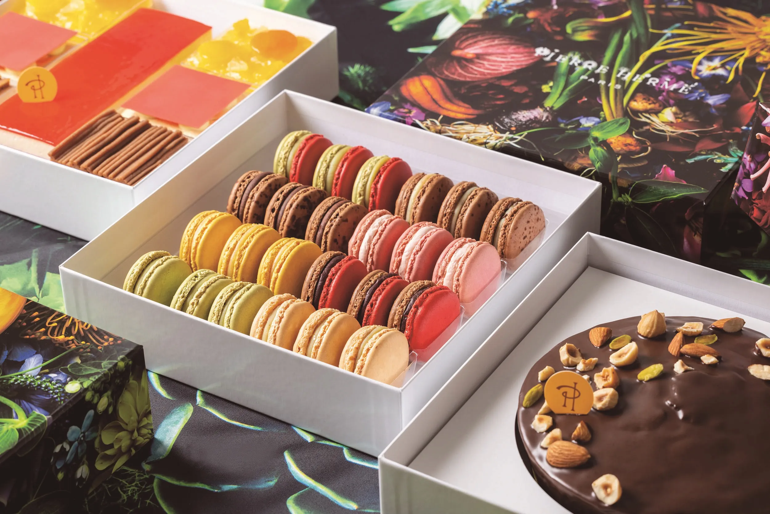 新年を彩るスイーツを詰め合わせたおせち。ケーキやマカロンなどピエール・エルメ・パリのスイーツを存分に楽しめます。フラワーアーティストのアレンジメントを使用した華やかな容器も特徴です。