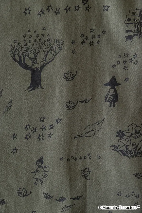 オーガニックコットン100%の深いグリーンのサテン地のシリーズは、北欧を代表する芸術家トーベ・ヤンソンの小説『ムーミン谷の十一月』に描かれる「星のなる木」やスナフキンたちの姿をイメージしたもの。ノスタルジックなプリントで、セットアップも可能なトップスとスカート、そしてワンピースをご用意しました。