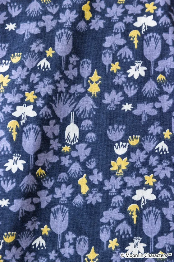 続いて、デイリーに使いやすいオーガニックコットン100%のカットソー素材のシリーズは、ラベンダー色の花畑に、リトルミイとスナフキンのシルエットを散りばめたプリント。こちらの柄で、ワンピースとトップス、スカートをご用意しました。