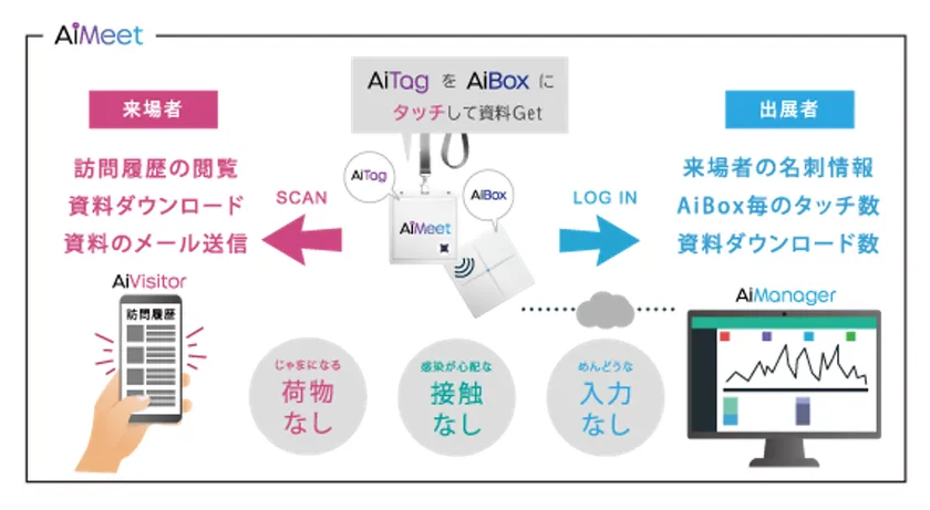 無線技術とクラウドベースアプリを利用したイベント・展示会用のIoTシステムです。NFC技術を使用したAiTag、NB-IoT/NFCの無線端末のAiBox、そしてクラウドベースのウェブアプリケーションのAiManagerから構成され、来場者と出展社の相互の情報交換可能な便利なシステムです。