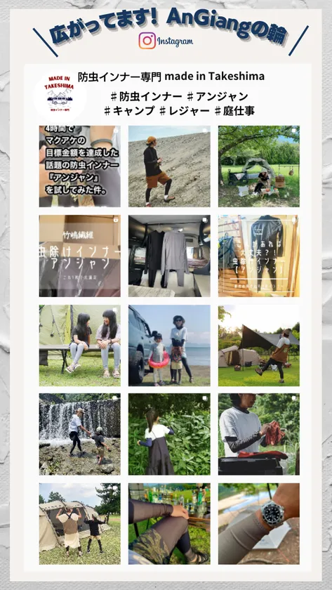 madeintakeshimaアンバサダーさんのお知り合いのキャンパーさんや、アウトドア好きさん、畑仕事や庭の掃除で虫に悩まされている方々より「商品が気になっている」とご連絡をいただく機会も多く、当社が想像していた以上に反響をいただいております。「ならば!」とSNSでの仲間を増やし、「アンジャンの輪(madeintakeshima公式アンバサダーの皆様の総称)」がスタート。