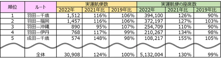 この期間運航された最多のルートは「羽田―千歳」で、2019年を上回る実運航便数(106%)となりました。しかしながら座席数では2019年比90%と4万席少ない結果となりました。昨年2021年同期比は116%、座席数は126%でした。今年のお盆期間に国内線最多運航ルートトップ5の詳細は以下の通りです。