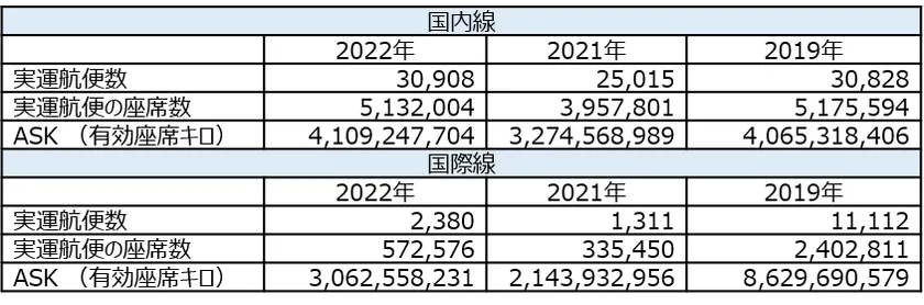 2022年のお盆期間の国内線実運航便数は30,908便でコロナ禍前である2019年の同時期(30,828便)をわずかに上回る結果となりました。一方で座席数は、43,590席減でした。