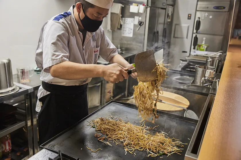 「想夫恋」では、麺をしっかりと焼き上げたものを「焼きそば」と考えています。炒めるのではなく、しっかりと焼き、カリッとした食感を作り上げる。それを「焼きそば」と定め、シンプルな具材でどこまでおいしくできるかを追求してきました。それが「想夫恋」の焼きそば「想夫恋焼き」です。