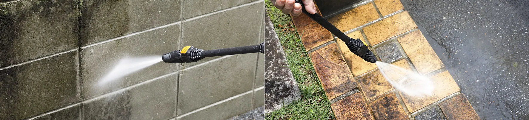 高圧洗浄機は、水道から吸水した水に約20倍※の高い圧力をかけた高水圧を噴射し、こびりついた汚れを洗浄します。使用する水の量は、通常のホースを使用するのに比べ、約1/3と少なく、節水効果もある環境にやさしい、エコな掃除ツールです。