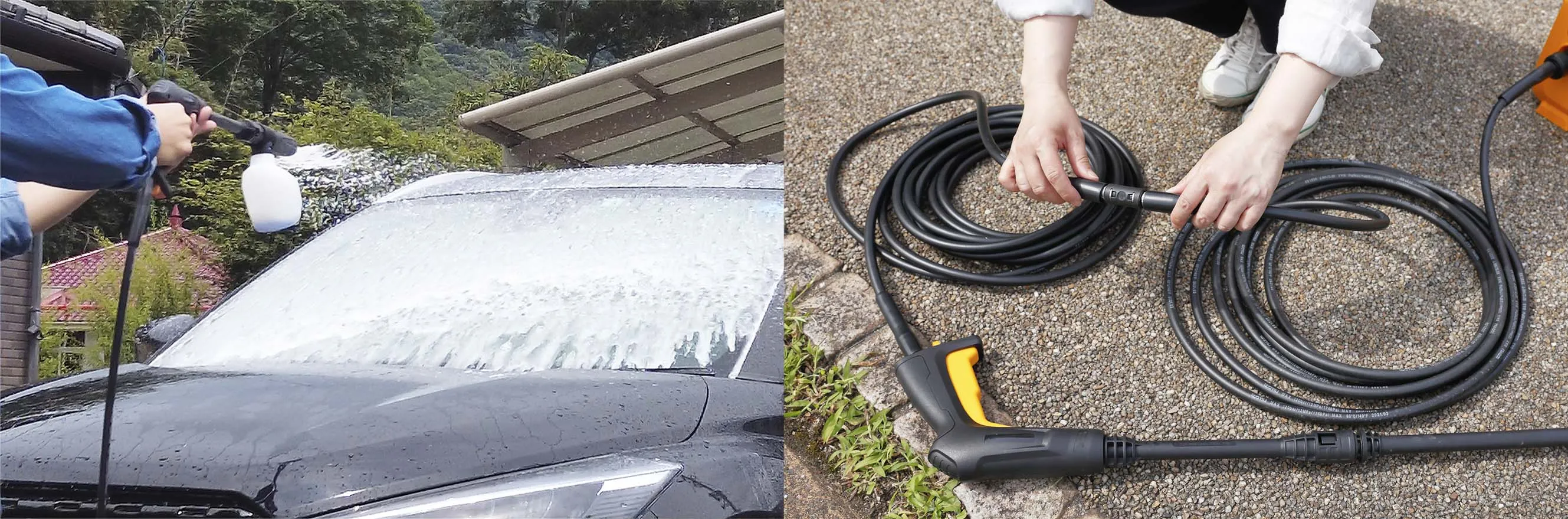 泡ノズル(左)と延長高圧ホース(右)