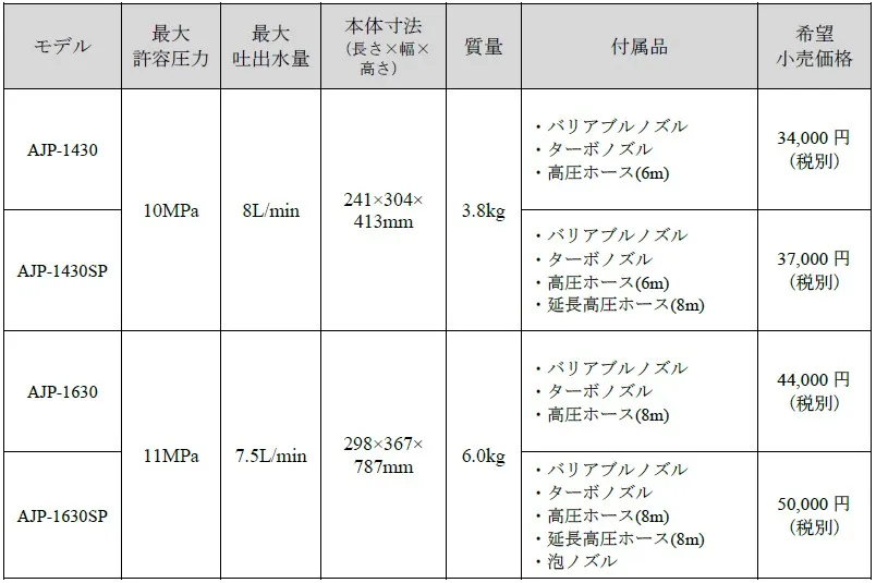 「AJP-1430」と「AJP-1630」には、それぞれお得なセットモデルも同時発売します。「AJP-1430SP」は、8mの延長高圧ホースを付属。「AJP-1630SP」は、洗車に便利な8mの延長高圧ホースに加え泡ノズルを付属しています。また、別販売品のオプションパーツでは、ブラシ類やノズルの角度が自由に調節できる洗浄用アクセサリーがあります。
