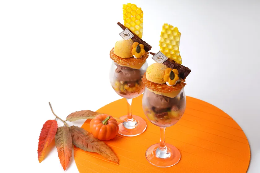 薄く焼き上げサクッと軽い食感のブラウニーで楽しんだ後は、口休めのかぼちゃやリンゴ、レーズンのハチミツ煮が秋を感じさせます。最後は爽やかなカシスソルベで締めくくる、秋の味覚がたっぷり詰まったパフェです。