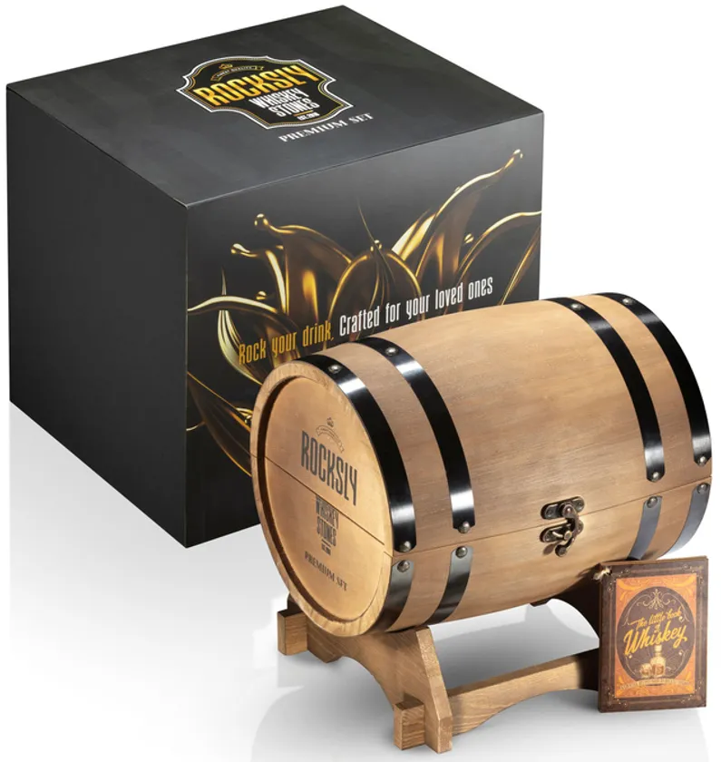 ウイスキーの樽を模した収納ケースと、そのケースを支えるスタンドです。全てのセットがスッキリと収まり、見た目もカッコいいデザインです。