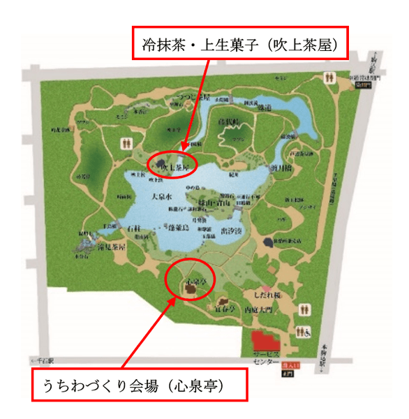 六義園 心泉亭(しんせんてい)(うちわづくり)・吹上(ふきあげ)茶屋(ちゃや)(冷抹茶・上生菓子)