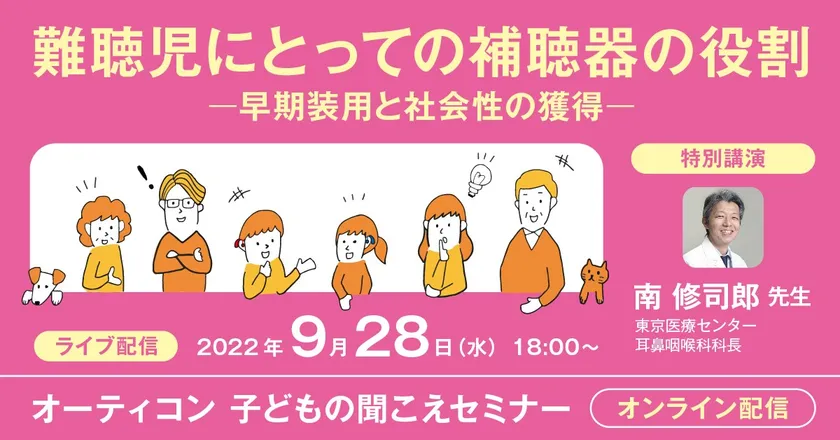 「難聴児にとっての補聴器の役割―早期装用と社会性の獲得について―」をテーマに、専門医による特別講演や当社最新の小児補聴器に関する情報をお届けします。本セミナーは聴覚に携わる専門家をはじめ、広く一般の方に視聴いただけるよう、費用は無料とし、事前申込でどなたでも参加が可能です。ライブ配信の申込受付は同日17時まで、オーティコン子どもの聞こえセミナー案内サイトにて受け付けます。また、ライブで参加が難しい方は、後日アーカイブ動画を視聴いただけます。