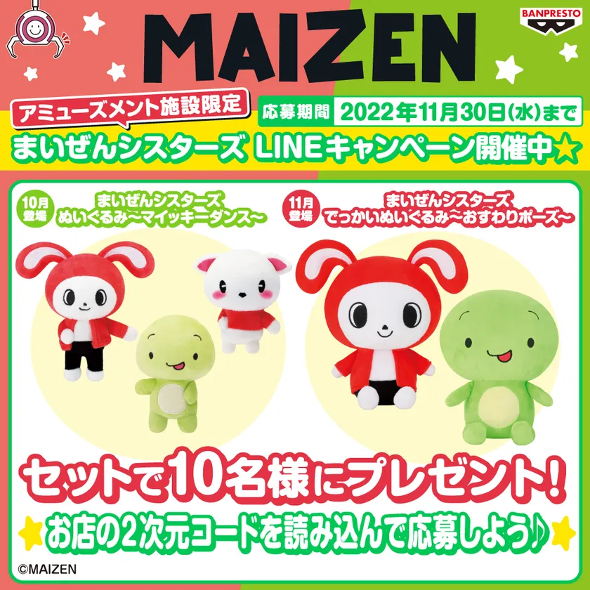 株式会社BANDAI SPIRITS プライズ事業部のバンプレストブランドは、全国のアミューズメント施設でYouTubeから生まれたキャラクター『まいぜんシスターズ』のぬいぐるみセットが抽選で貰える「アミューズメント施設限定まいぜんシスターズ LINEキャンペーン」を開催します。