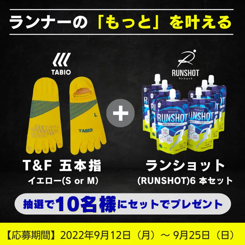 各商品の公式Twitterアカウントをフォローしてご応募いただいた方の中から抽選で10名様に、両社が選手の想いに応えたい一心で「走ること」にひたすら向き合って誕生させた人気商品「タビオ T&F」と「新田ゼラチン ランショット(RUNSHOT)」をプレゼントします。