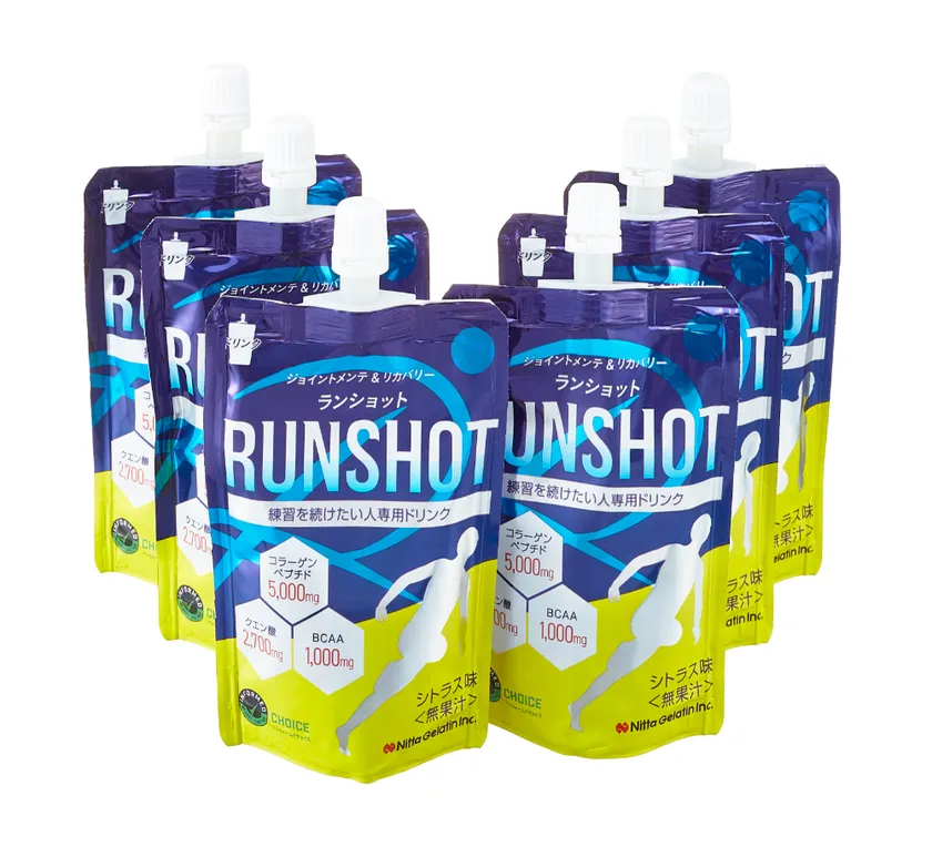 『ランショット(RUNSHOT)』は、城西大学男子駅伝部と新田ゼラチン株式会社が共同開発した「練習を続けたい人のためのサポートドリンク」です。現役選手の声から誕生した商品で、1本にたんぱく質であるコラーゲンペプチド5,000mg、クエン酸2,700mg、必須アミノ酸のBCAA1,000mgを配合し、練習後にも飲みやすいシトラス味のドリンクです。
