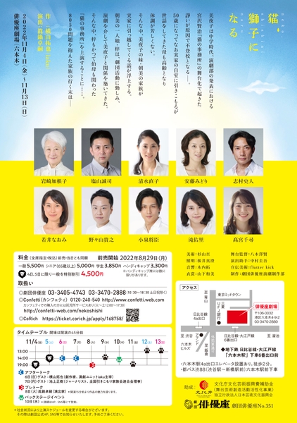 有限会社劇団俳優座(代表:東京都港区)主催、劇団俳優座No.351『猫、獅子になる』が2022年11月4日 (金) ~2022年11月13日 (日)に俳優座劇場(東京都港区六本木4-9-2)にて上演されます。