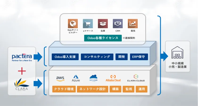 費用や社内IT人材の不足によりERP導入等のデジタル化が難しかった中小規模の小売・製造業向けに、多機能かつUI/UXに優れ、オープンソースで低価格のクラウド型ERPシステム「Odoo」の導入・運用をご支援します。パクテラが「Odoo」の導入コンサルティング・開発を、中小企業の情報システム部門のサポートに強みを持つクララオンラインがITインフラの設計・構築・監視・運用代行を提供することにより、導入・運用時の費用や工数を抑え、クライアントにおける小売・製造ビジネスの大幅な効率化を実現します。