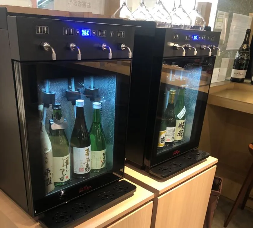 会場には、日本酒専用のサーバーを設置。日本酒の瓶の中に、窒素ガスを重鎮させることで日本酒の酸化を防ぎいつでもフレッシュな日本酒を楽しめます。ボタンを押すと決まった量の日本酒がサーブされるので、様々な日本酒を飲み比べいただけます。
