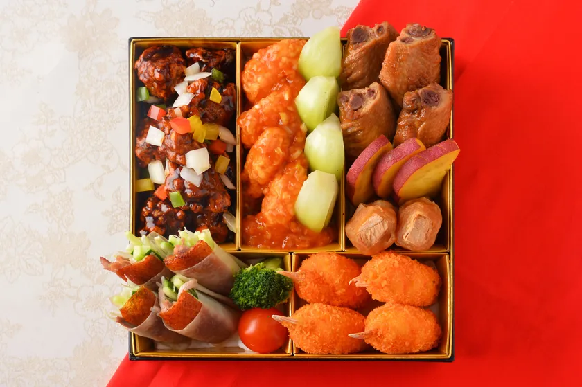 西洋料理のお重は、和牛ランプのローストビーフや海老の香草パン粉焼きなど豪華な素材を揃え、中国料理のお重は、北京ダックや大海老のチリソースで華やかに仕上げました。