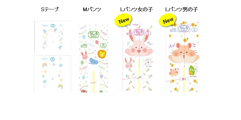 月齢が高くなると自我が芽生えることでスムーズなおむつ交換ができなくなるため、お子さまが進んでおむつ替えができように、L・ビッグサイズに、お子さまが好きな大きな動物柄のデザインを採用します。