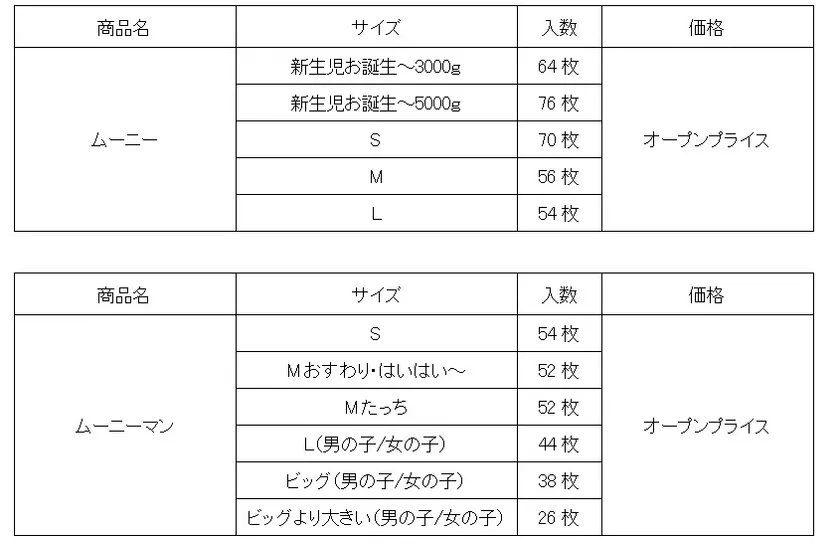 ムーニー:新生児お誕生~3,000g・Lサイズ ムーニーマン:L・ビッグ・ビッグより大きいサイズ
