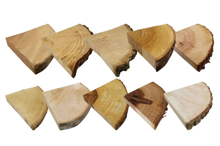 教材は、木の輪切りを4等分にした木片です。毎月届く「樹のケーキ」で、さまざまな樹種の肌触りや模様、香りが楽しめます。