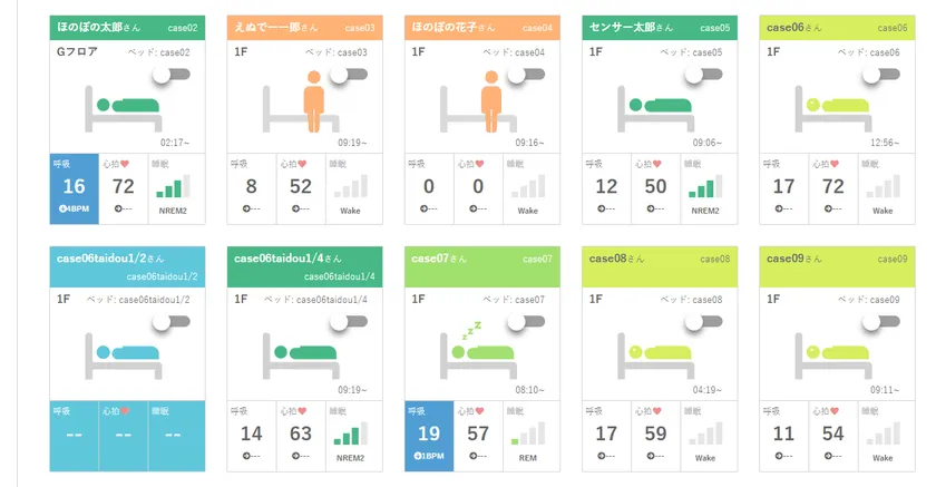センサー単体でご利用者の「心拍相当数」「呼吸相当数」「睡眠深度」を測し、Care Patrolにて表示します。閾値を設けることでアラート情報の発報にも対応します。