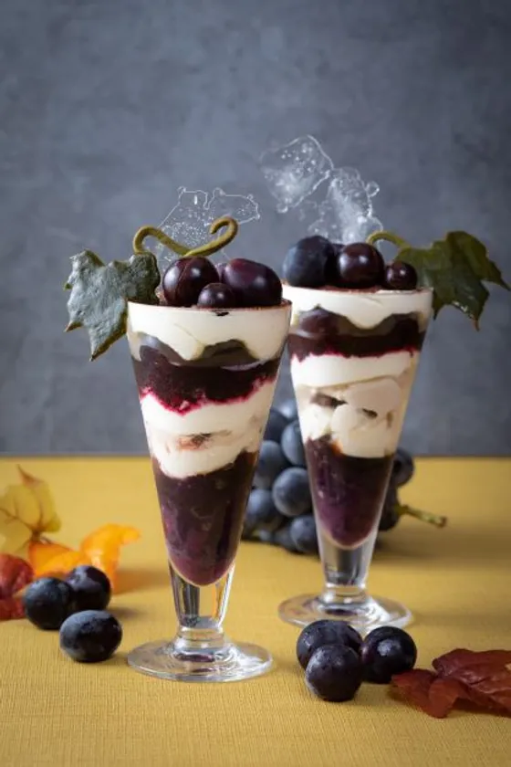 何層にも折り重なる、美しさと味わいを両立した贅沢パフェ“巨峰パフェ”は、新潟県産の種なし巨峰を使用したチョコレートのマリアージュが楽しいENTREオリジナル新作カフェメニューです。巨峰を惜しみなく、贅沢に使用したパフェの中身は、レモン果汁を加えた、巨峰のピューレやゼリー、自家製巨峰アイスクリーム、そしてさっぱりとした味わいを実現するためにバルサミコ酢とはちみつをあえた巨峰のマリネが入っています。また、満足感を得られるように、巨峰との相性が抜群のラム酒香るクリームチーズと自家製クランブルを合わせることで、それぞれの層を一緒にお召し上がりいただいた際、ザクザクとした食感も一緒にお楽しみいただけるような設計を施しました。