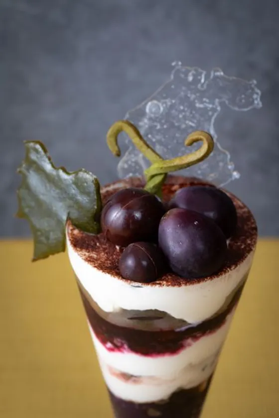 見た目の細部にもこだわっており、それぞれの層が重なることでのパフェらしい美しさはもちろん、パフェ全体が葡萄の房に見えるような可愛らしい見た目になっています。トップに飾られているフレッシュの巨峰と合わせるのは、当店自家製球体の巨峰ボンボンショコラ、トッピングに葡萄の葉っぱをイメージした抹茶のクッキーを添えることで、葡萄畑で採れるひと房の葡萄をイメージ。ボンボンショコラの中には、巨峰のリキュールをアクセントとした、グラニテ(シャーベット)を使用することで、チョコレートを割った際のさっぱりとした味わいが特徴的です。