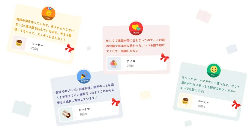 仕事におけるモチベーションやアウトプットの質は、チーム・組織内での人間関係に深く依存します。「ありがとう」を伝えられる関係や、働きを称え合える環境を築くことで、心理的安全性が高まり、従業員の信頼関係も構築され、働きがいを感じやすくなるのではないでしょうか。メッセージと一緒にデジタルギフトを送ることで、より一層コミュニケーションが活性化する潤滑油として作用していきます。結果、従業員一人ひとりが自己の感情を理解し、他者の感情や行動に目を向けるきっかけにつながります。