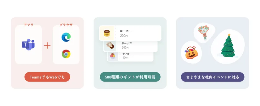 「ピアギフト」は、当社が提供する「チームステッカー」アプリを利用することでMicrosoft TeamsやWebなどで利用可能です。また、500種類のデジタルギフトに対応していく予定であり、贈る相手に合わせてギフトを選ぶ楽しみを体感できる他、感謝・称賛を伝えるコミュニケーションのきっかけとして、入社や納会、年末年始やクリスマスなど社内を盛り上げるイベントとしても活用できます。