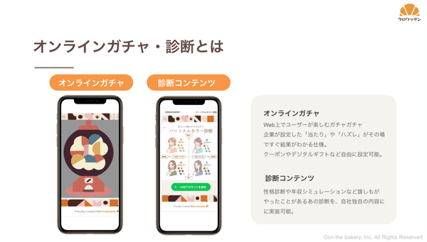 クロワッサンとは、ノーコードで簡単に企業が自社の好きなようにオリジナルのガチャや診断を作成できるプラットフォームです。