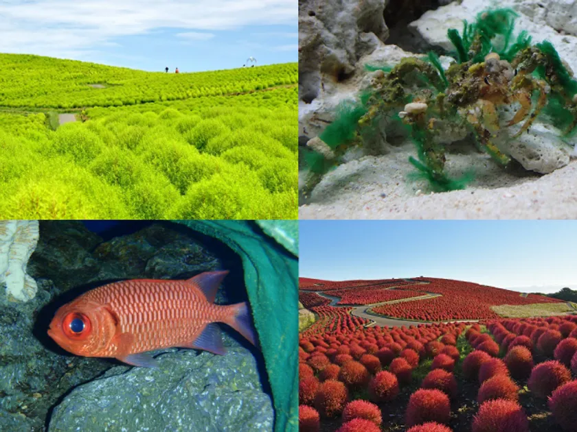 秋を迎えた国営ひたち海浜公園におきましても、みはらしの丘のコキアがいよいよ色づき始め、緑色から赤色へと変化していっております。この季節ならではの陸のコキアとともに、海のコキア水槽として、お楽しみいただけたらと思います。また、今回の水槽展示に合わせて、コキアにそっくりな“もふもふ”した特徴をもつアクアワールド・大洗の生き物たちも館内にパネルを設置して紹介いたします。