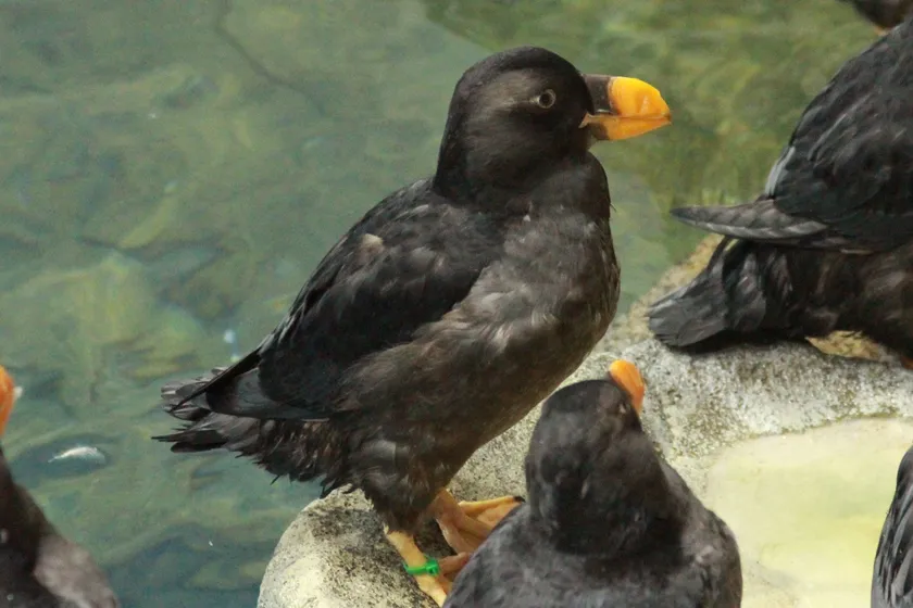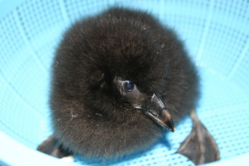 これから羽が生え変わる時期(換羽)を迎えるエトピリカです。白い顔に飾り羽が美しい夏羽の姿が有名ですが、“もふもふ”感たっぷりなのが全身真っ黒になる冬羽の姿です。さらに超“もふもふ”なのが、幼鳥のエトピリカです。期間限定のこの超“もふもふ”な姿は、生後10日くらいの様子で、バックヤードにいる飼育員しか見られない貴重な姿です。当館では、今年も3羽のヒナが生まれ、順調に巣立っています。