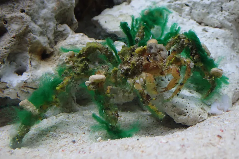 国営ひたち海浜公園「みはらしの丘」の写真を使用し、緑色から赤色へと紅葉するコキアに合わせて、水槽の背景を変化させます。また、もふもふとしたコキアを連想させる生き物として、自分の体に海藻などをくっつけて身を守る、カニの仲間のモクズショイを展示します。そのユニークな習性を生かし、コキアの紅葉に合わせて、緑色や赤色の毛糸を器用に身に着けた姿を紹介します。コキアの紅葉が見頃を迎える頃には、コキアに負けず劣らず美しい赤色が特徴のアカマツカサを展示します。陸のコキアとともに、海のコキア水槽をお楽しみください。