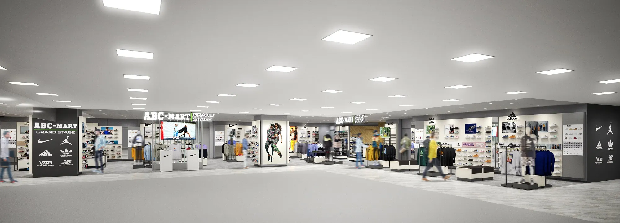 <ナイキ>や<アディダス>のスニーカーからアパレルまで取り揃える<ABCマートグランドステージ>。カジュアルシューズをベースにビジネス、レディース、キッズシューズなどを取り揃える<ABCマート>。2つのショップで幅広いニーズにお応えします。