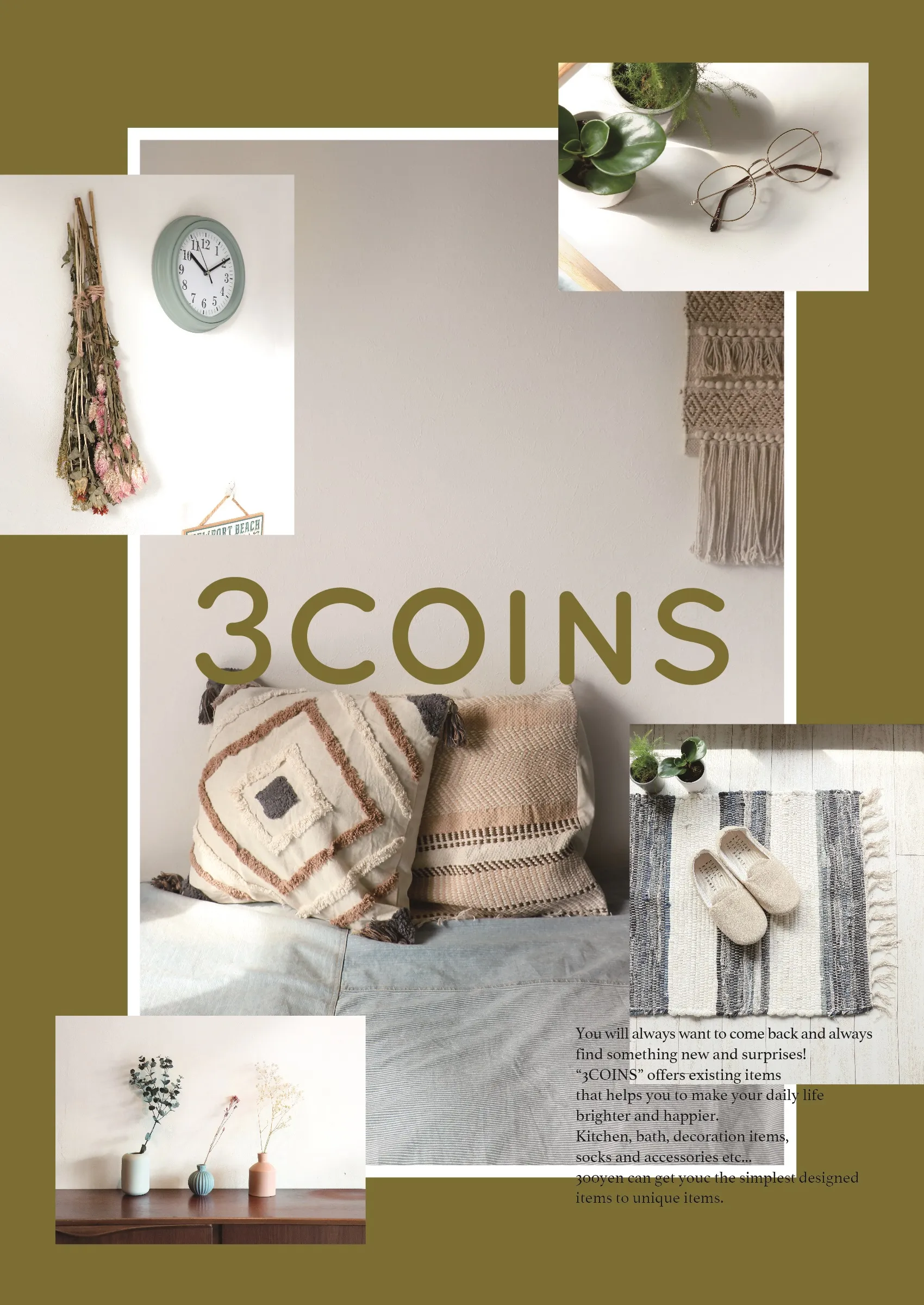 <スリーコインズ>は、「あなたの“ちょっと幸せ”をお手伝いする雑貨店」です。生活雑貨・インテリア雑貨・服飾雑貨・モバイルアイテム・キッズアイテム・食品など、ベーシックなものからデザイン性のあるものまで、様々なアイテムを、300円(税込330円)を中心に幅広く取り揃えています。