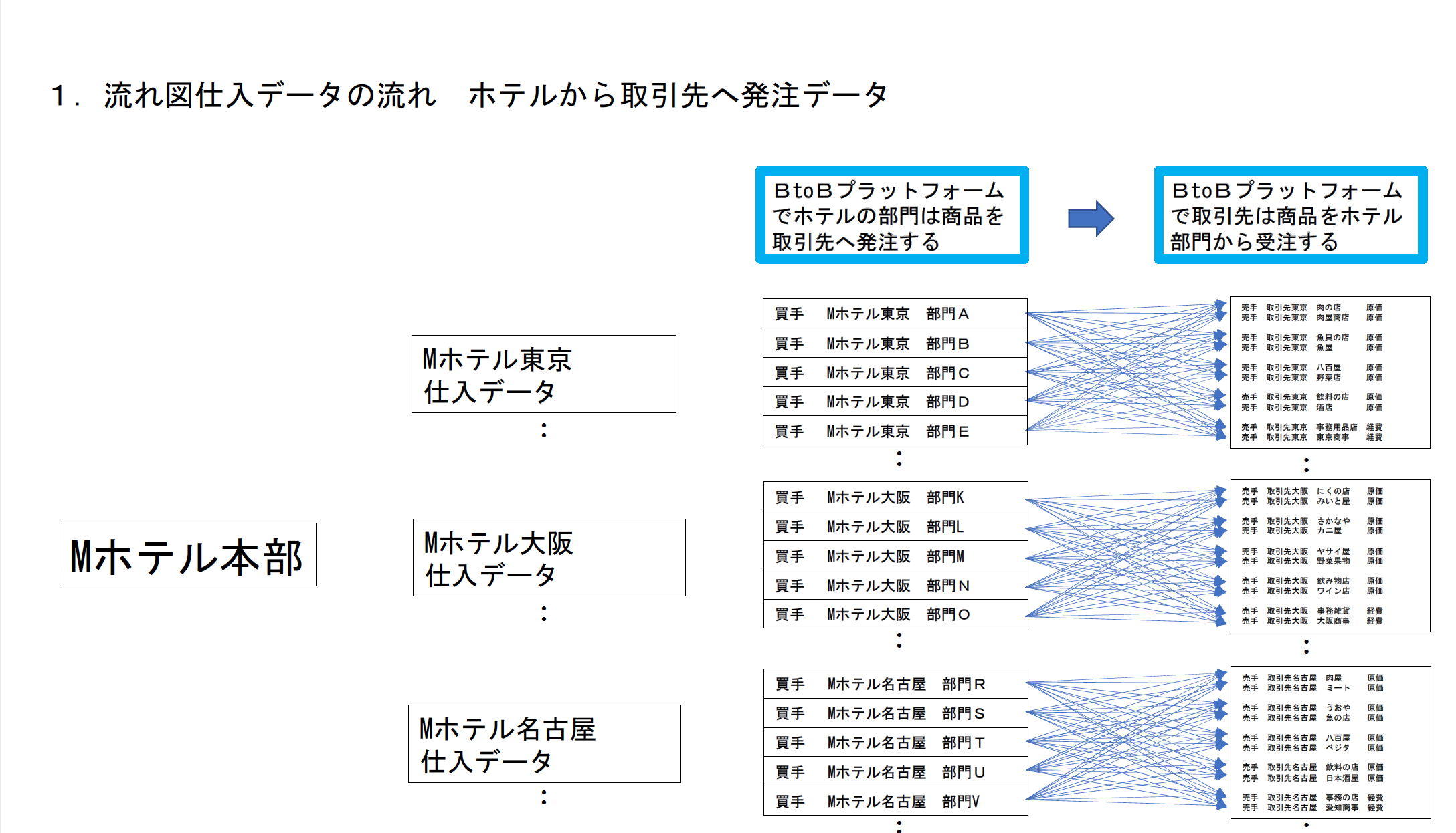 1、流れ図仕入データの流れ、ホテルから取引先へ発注依頼