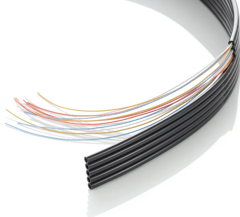 産業用ロボットの多くは電気か空気圧によって駆動され、空気を送る配管にはポリウレタン素材のチューブをフラット状に融着したフラットチューブやコイル状に加工したコイルチューブが用いられています。そのチューブの中に電力供給・電気信号送受信用のロボットケーブルを内蔵しているのが、メカトロチューブです。このメカトロチューブは、機器の稼働部などで使用され、屈折や伸展など激しい動きに対する高い耐久性・信頼性が求められます。メカトロチューブは、産業ロボットの動脈の役割を果たす重要なパーツです。