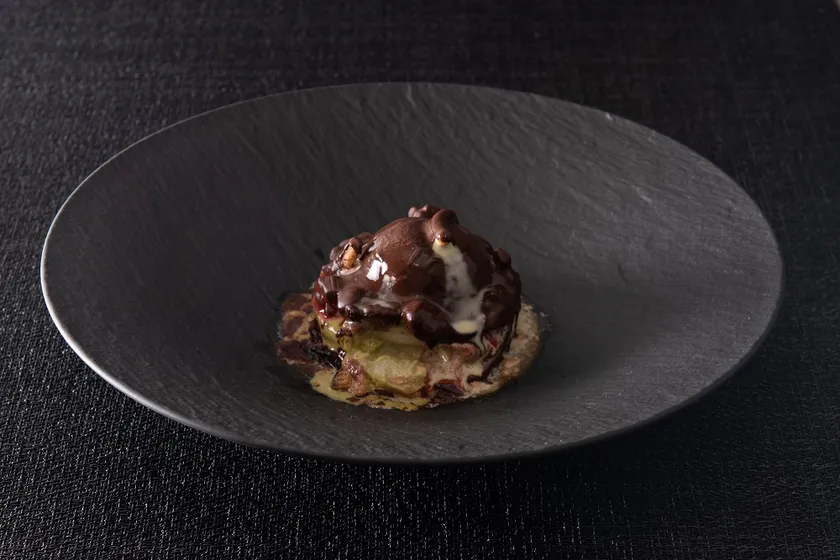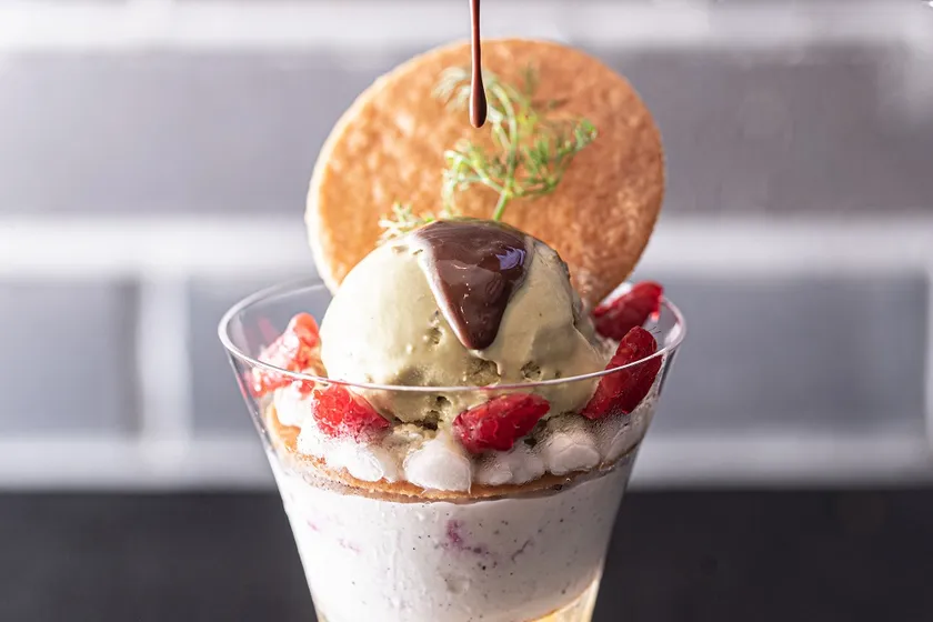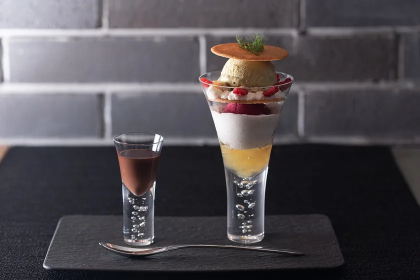 スプーンで崩しながらお召し上がりいただくパルフェ・ピスターシュ。上品な甘みに包まれたリンゴのコンポートジュレと、バニラ香るブラマンジェ。香り高い紅茶のジュレや、甘酸っぱいカシスシャーベット等、スプーンをすくう場所で異なる甘味や酸味の数々が、ピスタチオアイスクリーム特有の香ばしさをさらに引き立てます。秋の訪れとピスタチオの爽やかな緑を彷彿とさせる紅茶のジュレや、真っ赤なカシスシャーベットを施し、目でも楽しめる美しいスイーツに仕上げました。トッピングされたクッキーをお客様ご自身で砕き、仕上げにほろ苦い手作りチョコレートソースをかけて、クッキーのサクサク食感をアクセントにお召し上がりください。