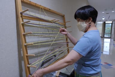 「被災地をつなぐさをり織り」は、たて糸は被災地、よこ糸はみなさんということで、たて糸を持って各地を巡回することで、被災地と共同制作を行い、次々と起こる様々な災害の被災者と作品を共同制作をすることで、被災地との新しい関係づくりなどを行います。