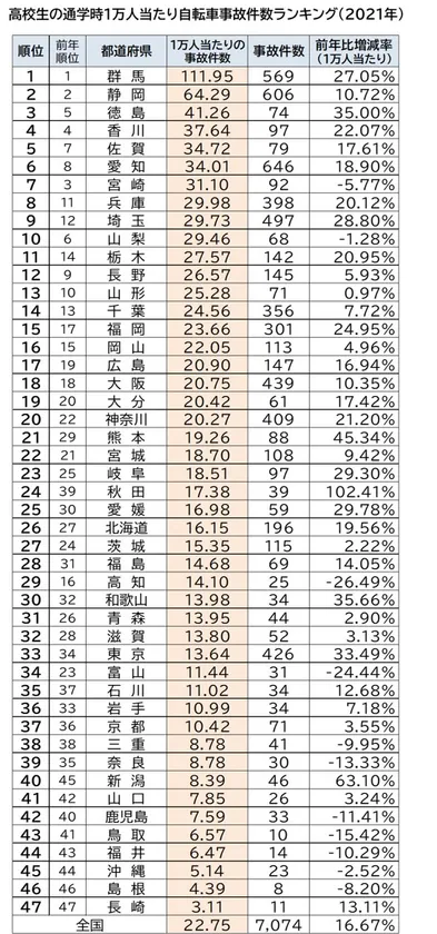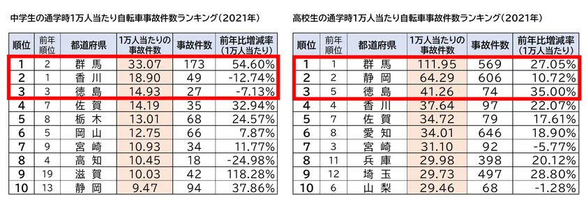 都道府県別では、前年に比べ1万人当たりの自転車事故件数が、中学生約6割、高校生約8割増加しています。中学生の1万人当たりの通学時自転車事故件数ワースト3は、1位「群馬県」、2位「香川県」、3位「徳島県」でした。群馬県では前年より約55%増加しています。高校生では調査開始から8年連続ワースト1位の「群馬県」に続き、2位「静岡県」、3位「徳島県」でした。