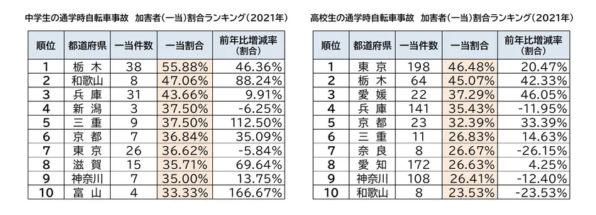 2021年は新型コロナウイルス感染拡大2年目となり、ワクチン接種の普及、休校や分散登校の緩和など、日常的な自転車利用が戻りつつあることによって、1万人当たりの通学時自転車事故件数は中学生14.7%、高校生16.7%と、ともに前年より増加しました。増加した都道府県は、中学生約6割、高校生約8割あることがわかりました。自転車通学指導は欠かすことのできない喫緊の課題であります。