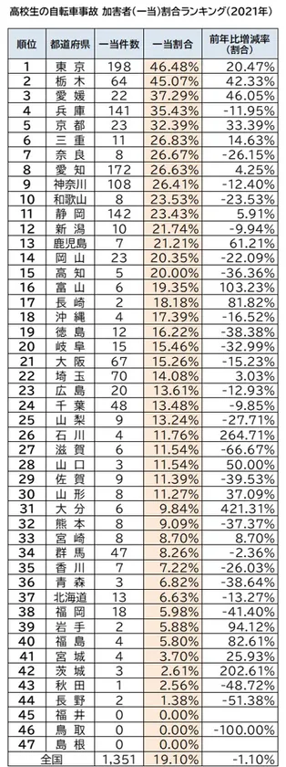 47都道府県高校生の自転車事故 加害者(一当)割合ランキング(2021年)