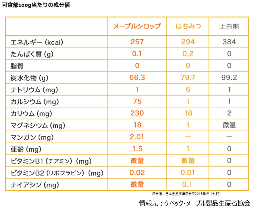 メープルシロップ栄養価比較表(100gあたり)