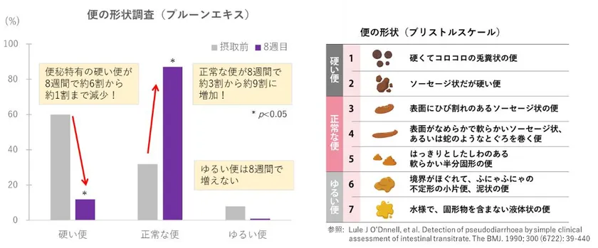 ・プルーンエキスを8週間食べ続けた結果、1週間で硬い便の形が変化し始めるとともに、正常な便の形が増えました。また、プルーンエキスは便秘でつらいと感じる自覚症状を顕著に改善しました。一方、プルーンエキスの摂取により下痢症状の悪化や腎障害、肝障害などの副作用は起こりませんでした。