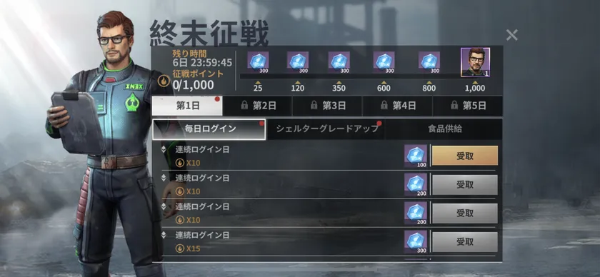 終末征戦ではミッションクリアで獲得できる征戦ポイントで、募集ポイントと生存資源を大量に入手する事ができます。さらに征戦ポイントを1,000獲得して、A級ビルドヒーロー「ヴォロウィッツ」を無料で手に入れるチャンス!ヴォロウィッツはシェルターのエンジニアで、シェルター建設、資源生産、ヒーローの遠征などに助力する事が可能で、効率的なサポート役に適しています。
