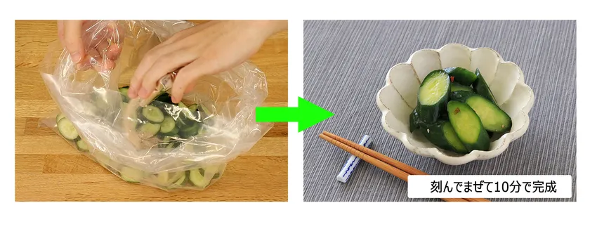 お好みの食材250~300gをよく水洗いして、食べやすい大きさに刻み、ポリ袋に食材と本品を入れてよく混ぜ合わせます。ポリ袋の空気をしっかり抜いて口を閉じ、冷蔵庫で漬け込みます。10分でサラダ風、一晩漬け込めば浅漬け風に仕上がります。